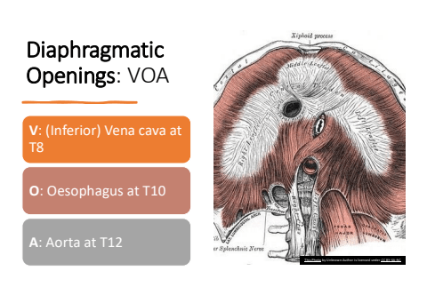 Diaphragmatic Openings: VOAV: (Inferior) Vena cava at T8O: Oesophagus at T10A: Aorta at T12This Photo by Unknown Author is licensed under CC BY-SA-NC