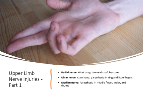 Upper Limb Nerve Injuries -Part 1%u2022 Radial nerve: Wrist drop, humeral shaft fracture%u2022 Ulnar nerve: Claw hand, paresthesia in ring and little fingers%u2022 Median nerve: Paresthesia in middle finger, index, and thumb