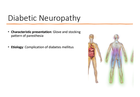 Diabetic Neuropathy%u2022 Characteristic presentation: Glove and stocking pattern of paresthesia%u2022 Etiology: Complication of diabetes mellitus