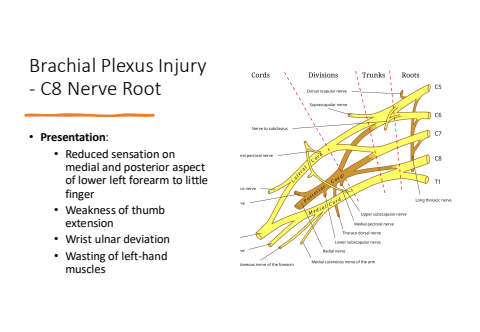 Brachial Plexus Injury - C8 Nerve Root%u2022 Presentation:%u2022 Reduced sensation on medial and posterior aspect of lower left forearm to little finger%u2022 Weakness of thumb extension%u2022 Wrist ulnar deviation%u2022 Wasting of left-hand muscles