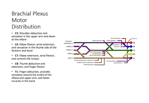 Brachial Plexus Motor Distribution%u2022 C5: Shoulder abduction and sensation in the upper arm and down to the elbow%u2022 C6: Elbow flexion, wrist extension, and sensation in the thumb side of the forearm and hand%u2022 C7: Elbow extension, wrist flexion, and controls the triceps%u2022 C8: Thumb abduction and extension, and finger flexion%u2022 T1: Finger abduction, provides sensation around the inside of the elbow and upper arm, and feeds muscles in the hand