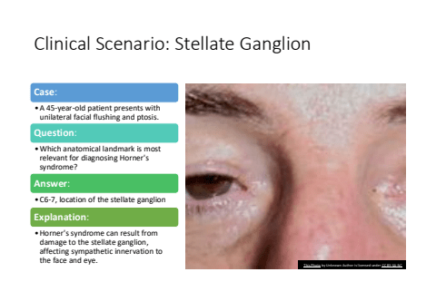 Clinical Scenario: Stellate GanglionCase:%u2022A 45-year-old patient presents with unilateral facial flushing and ptosis.Question:%u2022Which anatomical landmark is most relevant for diagnosing Horner's syndrome?Answer:%u2022C6-7, location of the stellate ganglionExplanation:%u2022Horner's syndrome can result from damage to the stellate ganglion, affecting sympathetic innervation to the face and eye.This Photo by Unknown Author is licensed under CC BY-SA-NC