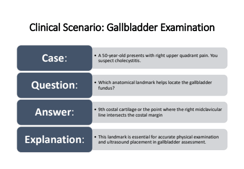 Clinical Scenario: Gallbladder Examination%u2022 A 50-year-old presents with right upper quadrant pain. You Case: suspect cholecystitis.%u2022 Which anatomical landmark helps locate the gallbladder Question: fundus?%u2022 9th costal cartilage or the point where the right midclavicular Answer: line intersects the costal margin%u2022 This landmark is essential for accurate physical examination Explanation: and ultrasound placement in gallbladder assessment.