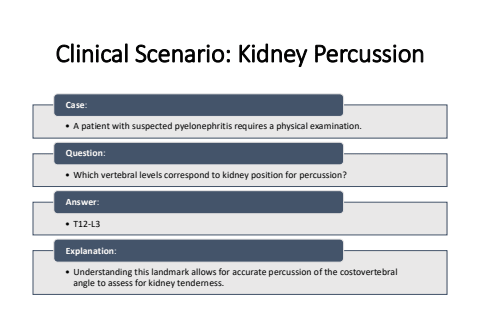 Clinical Scenario: Kidney Percussion%u2022 A patient with suspected pyelonephritis requires a physical examination.Case:%u2022 Which vertebral levels correspond to kidney position for percussion?Question:%u2022 T12-L3Answer:%u2022 Understanding this landmark allows for accurate percussion of the costovertebral angle to assess for kidney tenderness.Explanation: