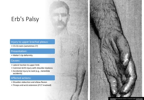 Erb's PalsyInjury to upper brachial plexus:%u2022 C5-C6 roots (sometimes C7)Presentation:%u2022 Waiter's tip deformityCauses:%u2022 Lateral traction to upper limb%u2022 Common birth injury with shoulder dystocia%u2022 Accidental injury to neck (e.g., motorbike accidents)Affected actions:%u2022 Shoulder abduction and elbow flexion%u2022 Triceps and wrist extension (if C7 involved)This Photo by Unknown Author is licensed under CC BY-SA-NC