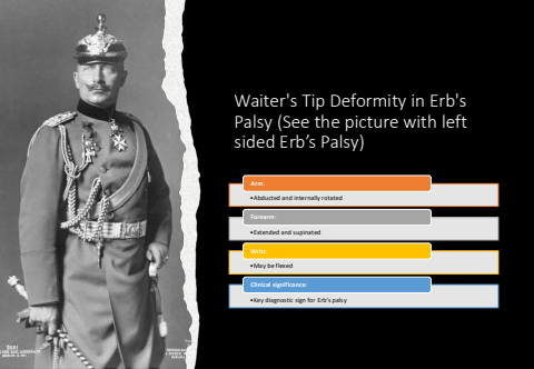 Waiter's Tip Deformity in Erb's Palsy (See the picture with left sided Erb%u2019s Palsy)%u2022Abducted and internally rotatedArm:%u2022Extended and supinatedForearm:%u2022May be flexedWrist:%u2022Key diagnostic sign for Erb's palsyClinical significance: