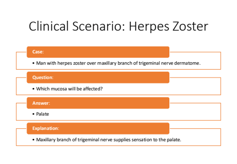 Clinical Scenario: Herpes Zoster%u2022 Man with herpes zoster over maxillary branch of trigeminal nerve dermatome.Case:%u2022 Which mucosa will be affected?Question:%u2022 PalateAnswer:%u2022 Maxillary branch of trigeminal nerve supplies sensation to the palate.Explanation: