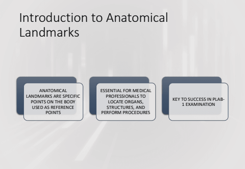 Introduction to Anatomical LandmarksANATOMICAL LANDMARKS ARE SPECIFIC POINTS ON THE BODY USED AS REFERENCE POINTSESSENTIAL FOR MEDICAL PROFESSIONALS TO LOCATE ORGANS, STRUCTURES, AND PERFORM PROCEDURESKEY TO SUCCESS IN PLAB1 EXAMINATION