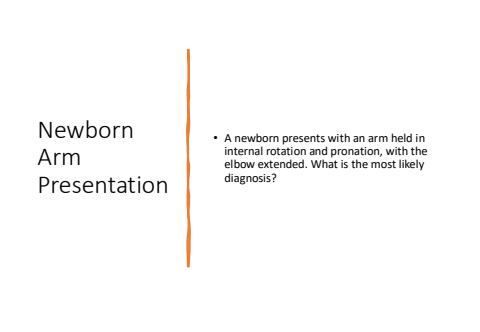 Newborn Arm Presentation%u2022 A newborn presents with an arm held in internal rotation and pronation, with the elbow extended. What is the most likely diagnosis?