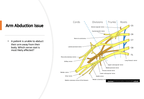 Arm Abduction Issue%u2022 A patient is unable to abduct their arm away from their body. Which nerve root is most likely affected?This Photo by Unknown Author is licensed under CC BY-SA