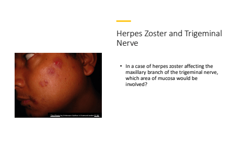 Herpes Zoster and Trigeminal Nerve%u2022 In a case of herpes zoster affecting the maxillary branch of the trigeminal nerve, which area of mucosa would be involved?This Photo by Unknown Author is licensed under CC BY