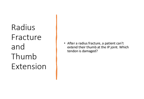 Radius Fracture and Thumb Extension%u2022 After a radius fracture, a patient can't extend their thumb at the IP joint. Which tendon is damaged?
