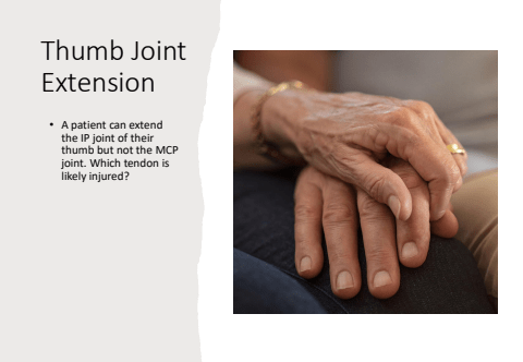 Thumb Joint Extension%u2022 A patient can extend the IP joint of their thumb but not the MCP joint. Which tendon is likely injured?