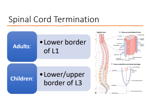 Spinal Cord Termination%u2022Lower border of L1 Adults:%u2022Lower/upper border of L3 Children: