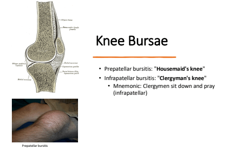 Knee Bursae%u2022 Prepatellar bursitis: \%u2022 Infrapatellar bursitis: \%u2022 Mnemonic: Clergymen sit down and pray (infrapatellar)Prepatellar bursitis