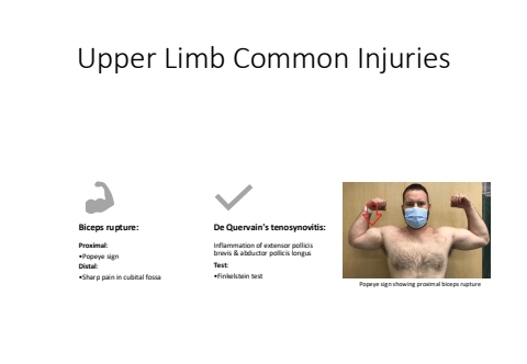 Upper Limb Common InjuriesBiceps rupture:Proximal:%u2022Popeye signDistal:%u2022Sharp pain in cubital fossaDe Quervain's tenosynovitis:Inflammation of extensor pollicis brevis & abductor pollicis longusTest:%u2022Finkelstein testPopeye sign showing proximal biceps rupture