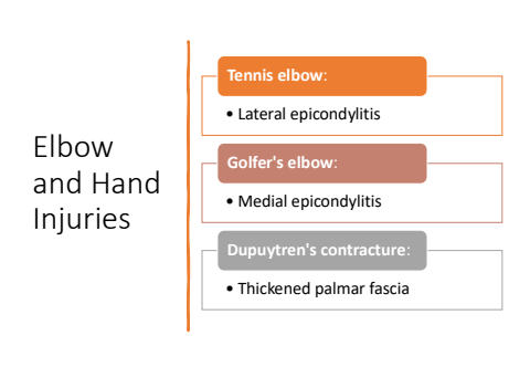 Elbow and Hand Injuries%u2022 Lateral epicondylitisTennis elbo%u2022 Medial epicondylitisGolfer's elbo%u2022 Thickened palmar fasciaDupuytren's contracture: