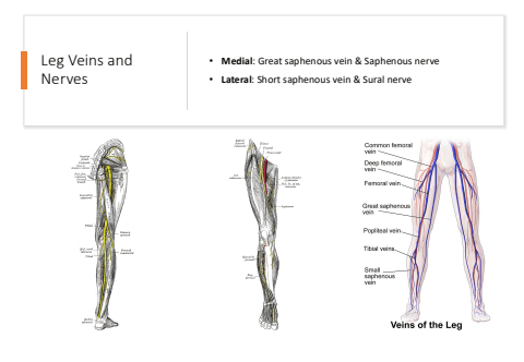 Leg Veins and Nerves%u2022 Medial: Great saphenous vein & Saphenous nerve %u2022 Lateral: Short saphenous vein & Sural nerve