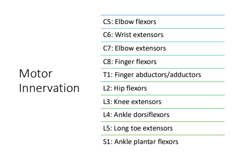 Motor InnervationC5: Elbow flexorsC6: Wrist extensorsC7: Elbow extensorsC8: Finger flexorsT1: Finger abductors/adductorsL2: Hip flexorsL3: Knee extensorsL4: Ankle dorsiflexorsL5: Long toe extensorsS1: Ankle plantar flexors