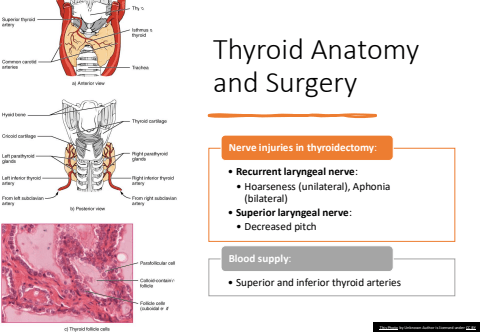 Thyroid Anatomy and Surgery%u2022 Recurrent laryngeal nerve:%u2022 Hoarseness (unilateral), Aphonia (bilateral)%u2022 Superior laryngeal nerve:%u2022 Decreased pitchNerve injuries in thyroidectomy:%u2022 Superior and inferior thyroid arteriesBlood supply:This Photo by Unknown Author is licensed under CC BY