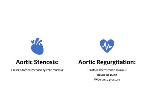 Cardiac Murmurs: Aortic Valve DisordersAortic Stenosis:Crescendo/decrescendo systolic murmurAortic Regurgitation:Diastolic decrescendo murmurBounding pulseWide pulse pressure