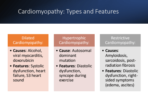 Cardiomyopathy: Types and FeaturesDilated Cardiomyopathy:%u2022 Causes: Alcohol, viral myocarditis, doxorubicin%u2022 Features: Systolic dysfunction, heart failure, S3 heart soundHypertrophic Cardiomyopathy:%u2022 Cause: Autosomal dominant mutation%u2022 Features: Diastolic dysfunction, syncope during exerciseRestrictive Cardiomyopathy:%u2022 Causes: Amyloidosis, sarcoidosis, postradiation fibrosis%u2022 Features: Diastolic dysfunction, rightsided symptoms (edema, ascites)