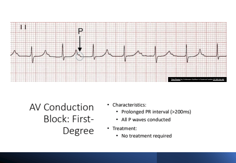 AV Conduction Block: FirstDegree%u2022 Characteristics:%u2022 Prolonged PR interval (>200ms)%u2022 All P waves conducted%u2022 Treatment:%u2022 No treatment requiredThis Photo by Unknown Author is licensed under CC BY-SA-NC