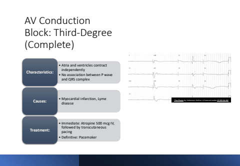AV Conduction Block: Third-Degree (Complete)%u2022 Atria and ventricles contract independently%u2022 No association between P wave and QRS complexCharacteristics:%u2022 Myocardial infarction, Lyme disease Causes:%u2022 Immediate: Atropine 500 mcg IV, followed by transcutaneous pacing%u2022 Definitive: PacemakerTreatment:This Photo by Unknown Author is licensed under CC BY-SA-NC