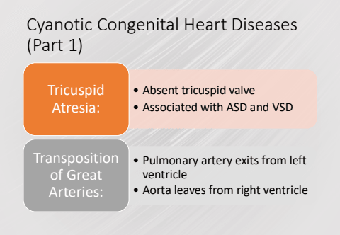 Cyanotic Congenital Heart Diseases (Part 1)%u2022 Absent tricuspid valve%u2022 Associated with ASD and VSDTricuspid Atresia:%u2022 Pulmonary artery exits from left ventricle%u2022 Aorta leaves from right ventricleTransposition of Great Arteries:
