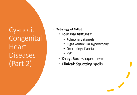 Cyanotic Congenital Heart Diseases (Part 2)%u2022 Tetralogy of Fallot:%u2022 Four key features:%u2022 Pulmonary stenosis%u2022 Right ventricular hypertrophy%u2022 Overriding of aorta%u2022 VSD%u2022 X-ray: Boot-shaped heart%u2022 Clinical: Squatting spells