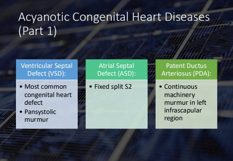 Acyanotic Congenital Heart Diseases (Part 1)Ventricular Septal Defect (VSD):%u2022 Most common congenital heart defect%u2022 Pansystolic murmurAtrial Septal Defect (ASD):%u2022 Fixed split S2Patent Ductus Arteriosus (PDA):%u2022 Continuous machinery murmur in left infrascapular region