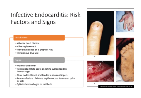 Infective Endocarditis: Risk Factors and Signs%u2022Valvular heart disease%u2022Valve replacement%u2022 Previous episode of IE (highest risk)%u2022 Intravenous drug useRisk Factors:%u2022Murmur and fever%u2022Roth spots: White spots on retina surrounded by hemorrhage%u2022Osler nodes: Raised and tender lesions on fingers%u2022 Janeway lesions: Painless, erythematous lesions on palm or sole%u2022 Splinter hemorrhages on nail bedsSigns:This Photo by Unknown Author is licensed under CC BY-NC-ND