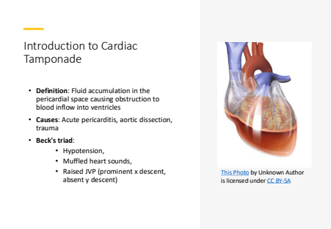 Introduction to Cardiac Tamponade%u2022 Definition: Fluid accumulation in the pericardial space causing obstruction to blood inflow into ventricles%u2022 Causes: Acute pericarditis, aortic dissection, trauma%u2022 Beck's triad:%u2022 Hypotension,%u2022 Muffled heart sounds,%u2022 Raised JVP (prominent x descent, absent y descent)This Photo by Unknown Author is licensed under CC BY-SA
