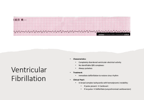 Ventricular Fibrillation%u2022 Characteristics:%u2022 Completely disordered ventricular electrical activity%u2022 No identifiable QRS complexes%u2022 Always pulseless%u2022 Treatment:%u2022 Immediate defibrillation to restore sinus rhythm%u2022 Clinical Pearl:%u2022 In broad complex tachycardia with hemodynamic instability:%u2022 If pulse present %u2192 Cardiovert%u2022 If no pulse %u2192 Defibrillate (unsynchronized cardioversion)This Photo by Unknown Author is licensed under CC BY-SA