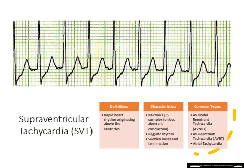 Supraventricular Tachycardia (SVT)Definition:%u2022 Rapid heart rhythm originating above the ventriclesCharacteristics:%u2022 Narrow QRS complex (unless aberrant conduction)%u2022 Regular rhythm%u2022 Sudden onset and terminationCommon Types:%u2022 AV Nodal Reentrant Tachycardia (AVNRT)%u2022 AV Reentrant Tachycardia (AVRT)%u2022 Atrial TachycardiaThis Photo by Unknown Author is licensed under CC BY-SA