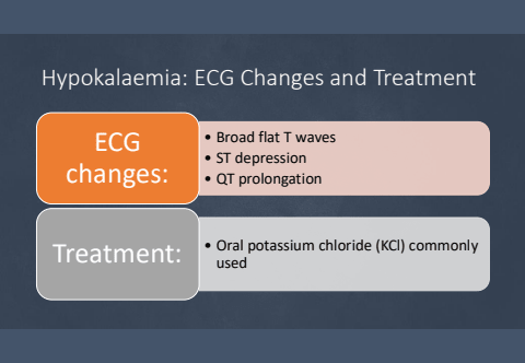Hypokalaemia: ECG Changes and Treatment%u2022 Broad flat T waves%u2022 ST depression%u2022 QT prolongationECG changes:%u2022 Oral potassium chloride (KCl) commonly Treatment: used