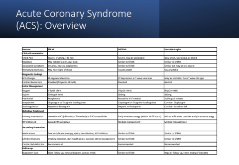 Acute Coronary Syndrome (ACS): OverviewFeature STEMI NSTEMI Unstable AnginaClinical PresentationChest Pain Severe, crushing, >30 min Severe, may be prolonged New onset, worsening, or at restRadiation May radiate to arm, jaw, back Similar to STEMI Similar to STEMIAssociated Symptoms Dyspnea, nausea, diaphoresis Similar to STEMI Similar but may be less severeHemodynamic Status May have signs of shock Usually stable Usually stableDiagnostic FindingsECG Changes ST-segment elevation ST depression or T wave inversion May be normal or have T wave changesCardiac Biomarkers Elevated (Troponin, CK-MB) Elevated NormalInitial ManagementOxygen If SpO2 <94% If SpO2 <94% If SpO2 <94%Aspirin 300mg chewed 300mg 300mgPain Relief Morphine IV Morphine IV if needed Sublingual nitratesAntiplatelet Clopidogrel or Ticagrelor loading dose Clopidogrel or Ticagrelor loading dose Consider ClopidogrelAnticoagulation Heparin or Enoxaparin Heparin or Enoxaparin Consider based on riskDefinitive TreatmentPrimary Intervention Immediate PCI (<90 min) or Thrombolysis if PCI unavailable Early invasive strategy (within 24-72 hours) Risk stratification, consider early invasive strategyIf PCI Delayed Consider thrombolysis Medical management Medical managementSecondary PreventionMedications Dual antiplatelet therapy, statin, beta-blocker, ACE inhibitor Similar to STEMI Similar to STEMILifestyle Changes Smoking cessation, diet modification, exercise, stress management Similar to STEMI Similar to STEMICardiac Rehabilitation Recommended Recommended RecommendedFollow-upOutpatient Care Close follow-up, echocardiogram, cardiac rehab Similar to STEMI Regular follow-up, stress testing if indicated
