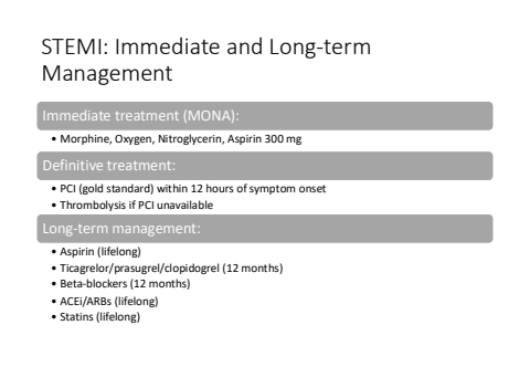 STEMI: Immediate and Long-term ManagementImmediate treatment (MONA):%u2022 Morphine, Oxygen, Nitroglycerin, Aspirin 300 mgDefinitive treatment:%u2022 PCI (gold standard) within 12 hours of symptom onset%u2022 Thrombolysis if PCI unavailableLong-term management:%u2022 Aspirin (lifelong)%u2022 Ticagrelor/prasugrel/clopidogrel (12 months)%u2022 Beta-blockers (12 months)%u2022 ACEi/ARBs (lifelong)%u2022 Statins (lifelong)