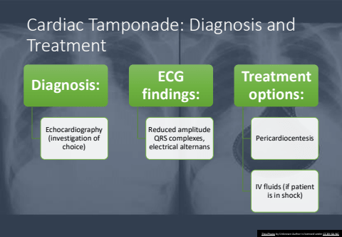 Cardiac Tamponade: Diagnosis and TreatmentDiagnosis:Echocardiography (investigation of choice)ECG findings:Reduced amplitude QRS complexes, electrical alternansTreatment options:PericardiocentesisIV fluids (if patient is in shock)This Photo by Unknown Author is licensed under CC BY-SA-NC