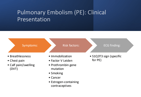 Pulmonary Embolism (PE): Clinical PresentationSymptoms:%u2022 Breathlessness%u2022 Chest pain%u2022 Calf pain/swelling (DVT)Risk factors:%u2022 Immobilization%u2022 Factor V Leiden%u2022 Prothrombin gene mutation%u2022 Smoking%u2022 Cancer%u2022 Estrogen-containing contraceptivesECG finding:%u2022 S1Q3T3 sign (specific for PE)