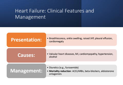 Heart Failure: Clinical Features and Management%u2022 Breathlessness, ankle swelling, raised JVP, pleural effusion, Presentation: cardiomegaly%u2022 Valvular heart diseases, MI, cardiomyopathy, hypertension, Causes: alcohol%u2022 Diuretics (e.g., furosemide)%u2022 Mortality reduction: ACEi/ARBs, beta-blockers, aldosterone Management:antagonists