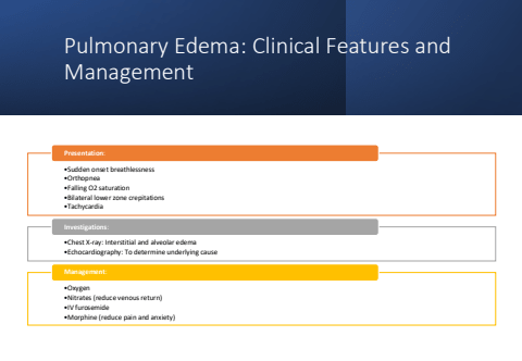Pulmonary Edema: Clinical Features and Management%u2022Sudden onset breathlessness%u2022Orthopnea%u2022Falling O2 saturation%u2022Bilateral lower zone crepitations%u2022TachycardiaPresentation:%u2022Chest X-ray: Interstitial and alveolar edema%u2022Echocardiography: To determine underlying causeInvestigations:%u2022Oxygen%u2022Nitrates (reduce venous return)%u2022IV furosemide%u2022Morphine (reduce pain and anxiety)Management:
