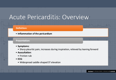 Acute Pericarditis: Overview%u2022 Inflammation of the pericardiumDefinition:%u2022 Symptoms:%u2022 Sharp pleuritic pain, increases during inspiration, relieved by leaning forward%u2022 Auscultation:%u2022 Friction rub%u2022 ECG:%u2022 Widespread saddle-shaped ST elevationPresentation:This Photo by Unknown Author is licensed under CC BY-NC