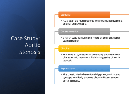 Case Study: Aortic Stenosis%u2022 A 75-year-old man presents with exertional dyspnea, angina, and syncope.Scenario:%u2022 a harsh systolic murmur is heard at the right upper sternal border.On examination:%u2022 This triad of symptoms in an elderly patient with a characteristic murmur is highly suggestive of aortic stenosis.Clincher:%u2022 The classic triad of exertional dyspnea, angina, and syncope in elderly patients often indicates severe aortic stenosis.Explanation: