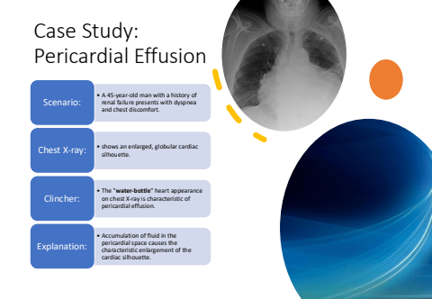 Case Study: Pericardial Effusion%u2022 A 45-year-old man with a history of renal failure presents with dyspnea and chest discomfort.Scenario:%u2022 shows an enlarged, globular cardiac silhouette. Chest X-ray:%u2022 The \on chest X-ray is characteristic of pericardial effusion.Clincher:%u2022 Accumulation of fluid in the pericardial space causes the characteristic enlargement of the cardiac silhouette.Explanation:
