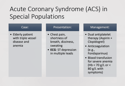 Acute Coronary Syndrome (ACS) in Special PopulationsCase:%u2022 Elderly patient with triple vessel disease and anemiaPresentation:%u2022 Chest pain, shortness of breath, dizziness, sweating%u2022 ECG: ST depression in multiple leadsManagement:%u2022 Dual antiplatelet therapy (Aspirin + Clopidogrel)%u2022 Anticoagulation (e.g., Fondaparinux)%u2022 Blood transfusion for severe anemia (Hb < 70 g/L or < 80 g/L with symptoms)