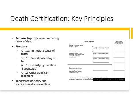 Death Certification: Key Principles%u2022 Purpose: Legal document recording cause of death%u2022 Structure:%u2022 Part 1a: Immediate cause of death%u2022 Part 1b: Condition leading to 1a%u2022 Part 1c: Underlying condition (if applicable)%u2022 Part 2: Other significant conditions%u2022 Importance of clarity and specificity in documentationThis Photo by Unknown Author is licensed under CC BY-NC