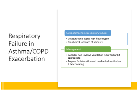 Respiratory Failure in Asthma/COPD Exacerbation%u2022Desaturation despite high-flow oxygen%u2022Silent chest (absence of wheeze)Signs of impending respiratory failure:%u2022Consider non-invasive ventilation (CPAP/BiPAP) if appropriate%u2022Prepare for intubation and mechanical ventilation if deterioratingManagement: