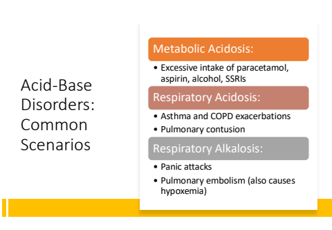 Acid-Base Disorders: Common ScenariosMetabolic Acidosis:%u2022 Excessive intake of paracetamol, aspirin, alcohol, SSRIsRespiratory Acidosis:%u2022 Asthma and COPD exacerbations%u2022 Pulmonary contusionRespiratory Alkalosis:%u2022 Panic attacks%u2022 Pulmonary embolism (also causes hypoxemia)