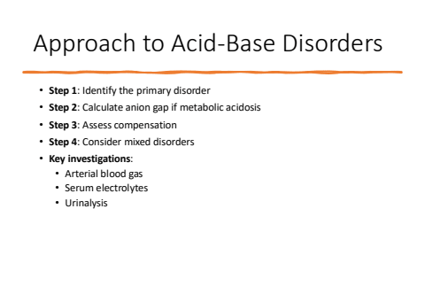 Approach to Acid-Base Disorders%u2022 Step 1: Identify the primary disorder%u2022 Step 2: Calculate anion gap if metabolic acidosis%u2022 Step 3: Assess compensation%u2022 Step 4: Consider mixed disorders%u2022 Key investigations:%u2022 Arterial blood gas%u2022 Serum electrolytes%u2022 Urinalysis